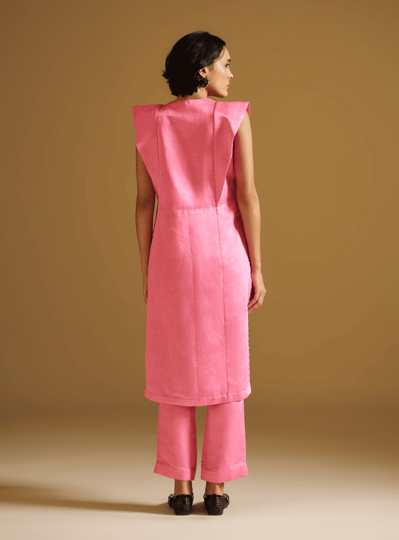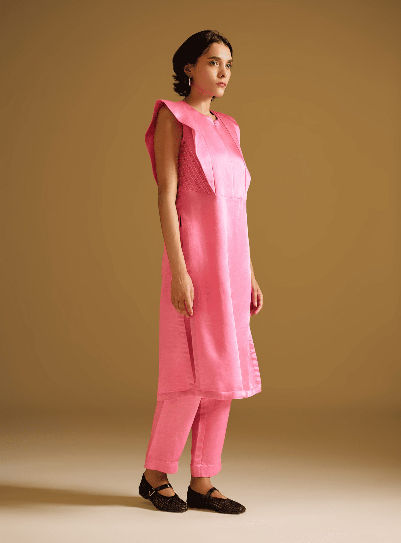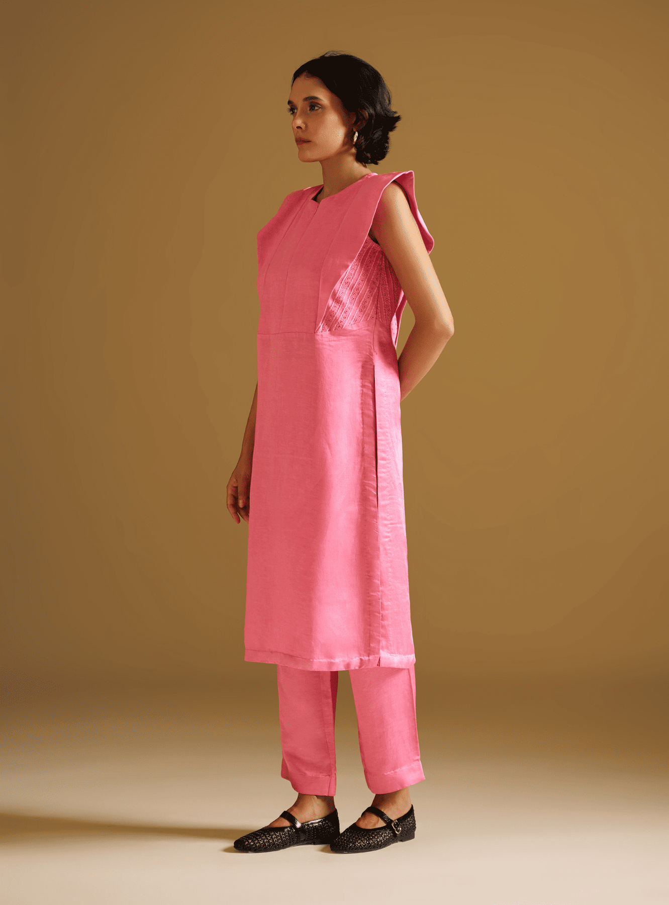 Featuring our vibrant pink tunic set crafted in lustrous silk linen fabric. The sleeveless tunic features striking extended shoulders and sharp pleated detailing along the front. A standout element lies in the side panels, which are intricately embroidered with tone-on-tone resham thread, subtle yet exquisitely detailed. Paired with straight-cut matching pants, it’s a go-to outfit.