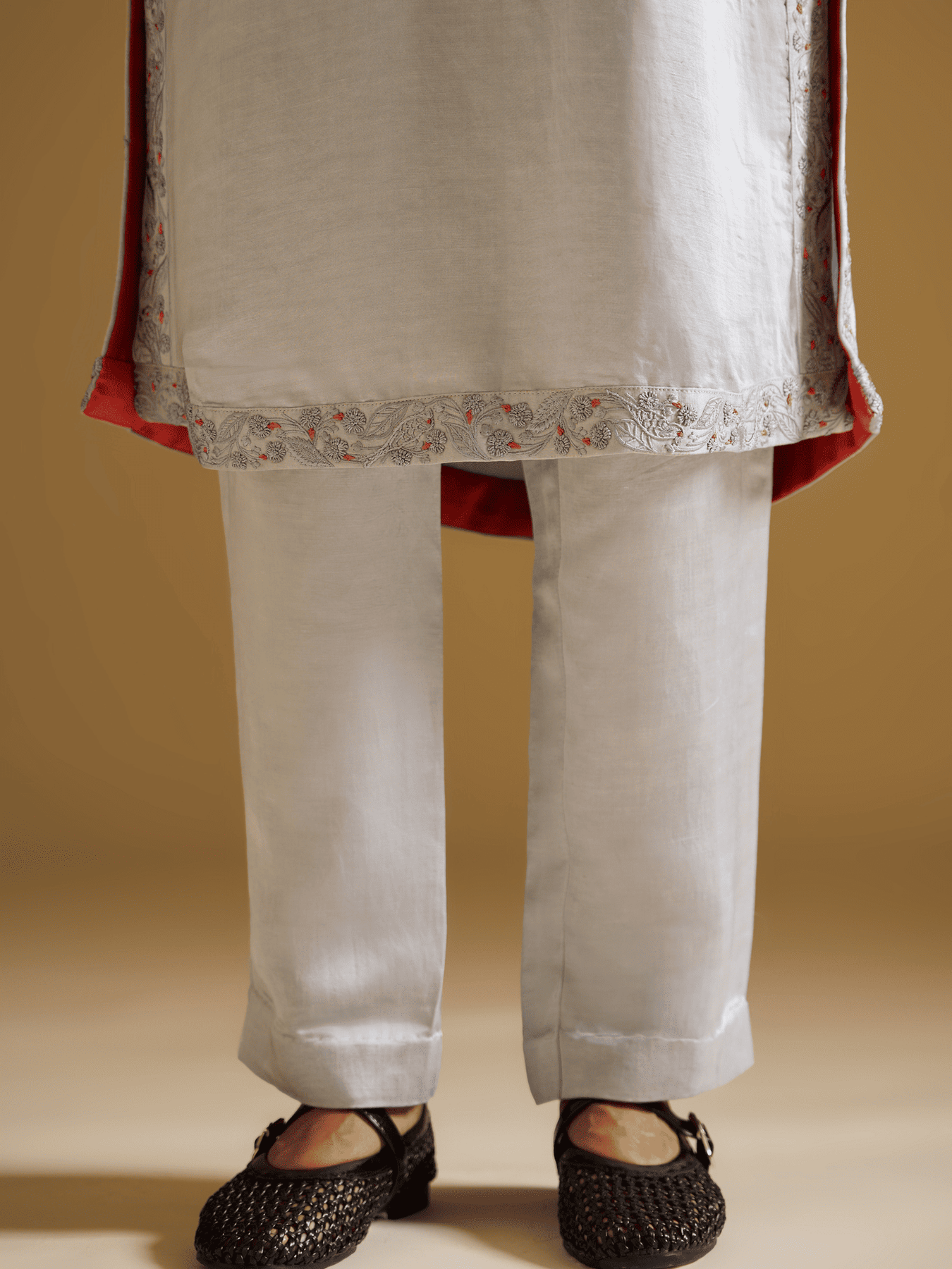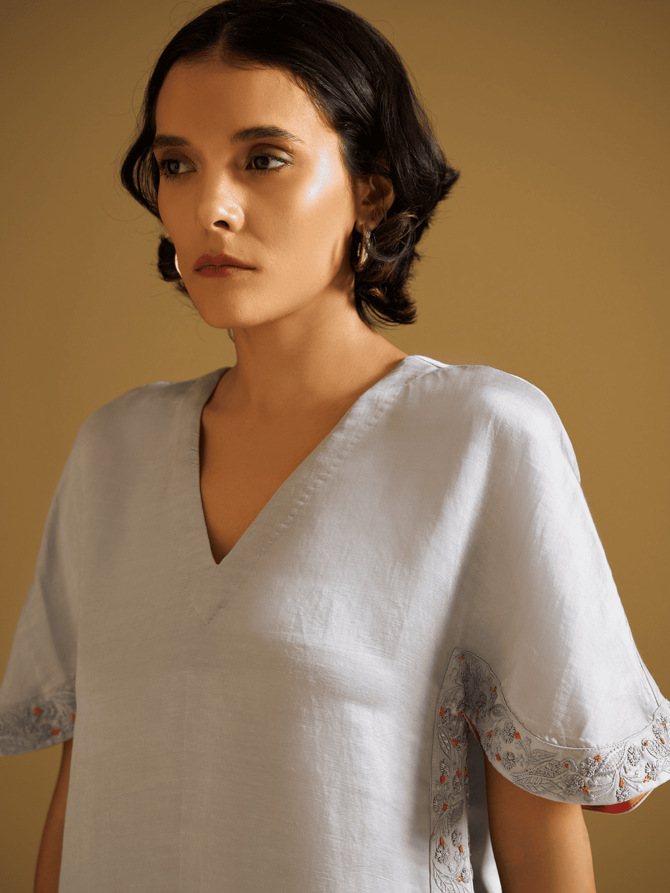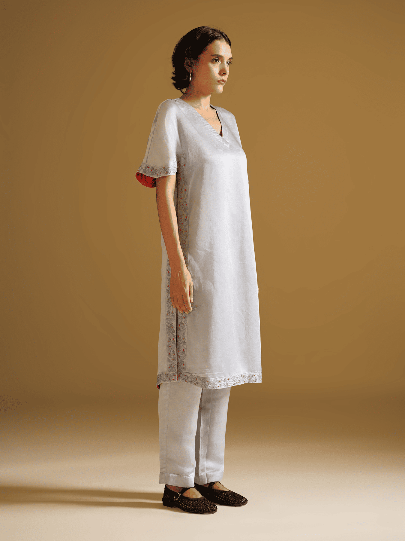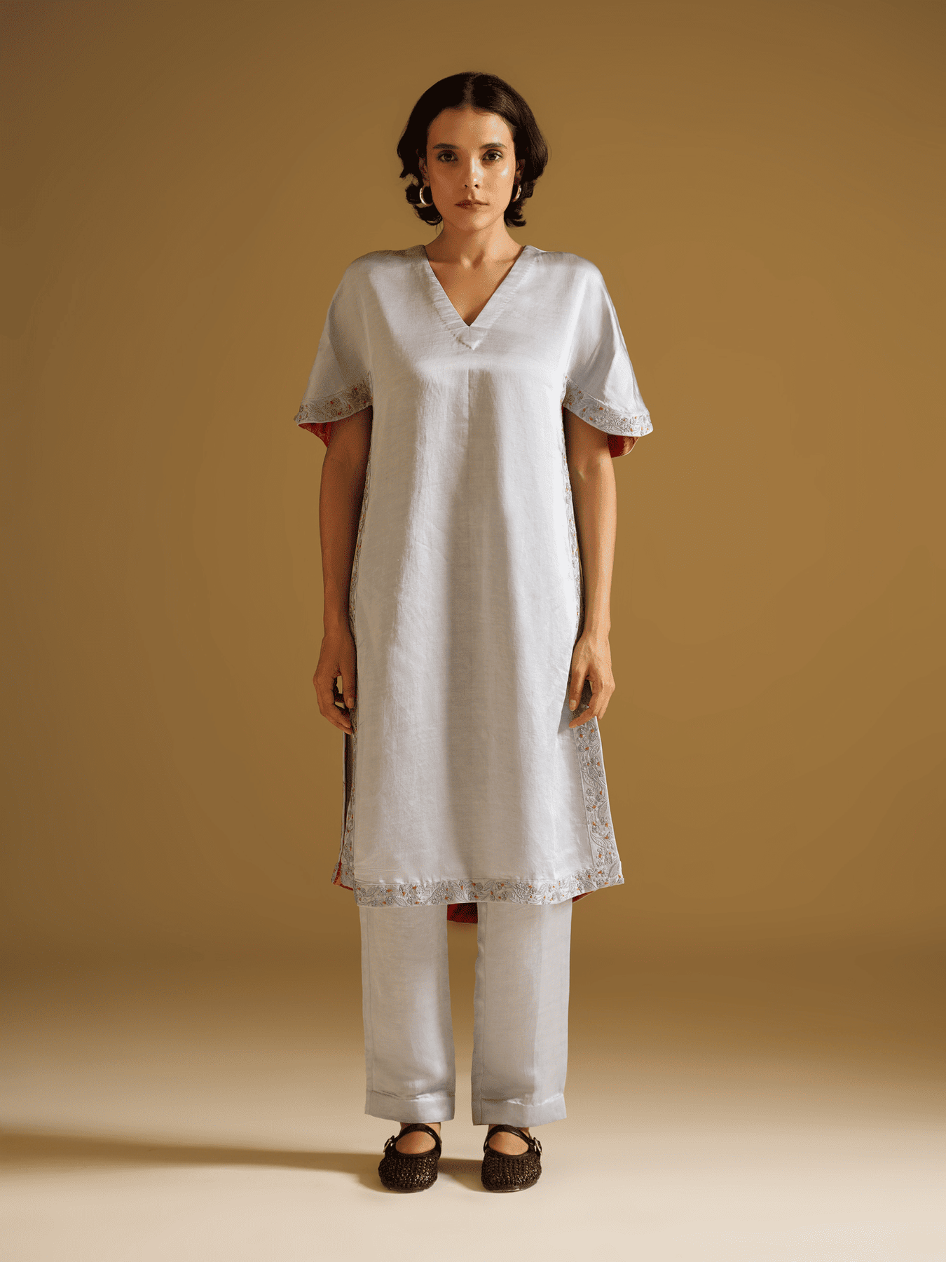 Featuring our elegant powder blue kurta set. The relaxed V-neck silhouette features short sleeves and a straight-cut hem. Delicate floral embroidery in muted tones of blue and coral runs along the sleeve cuffs and side panels, adding a refined touch of texture and craftsmanship. A subtle contrast facing peeks through the sleeves. Paired with matching straight-fit trousers, this set is ideal for those who appreciate timeless style with a hint of modern flair.