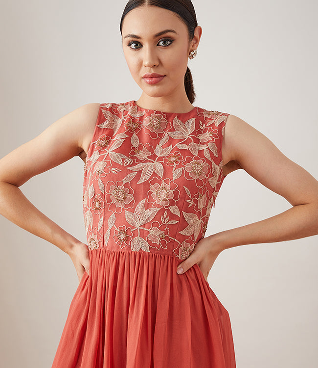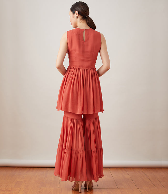 Featuring a Rust Garara set. The georgette top has a delicate applique, thread embroidery on a floral motif and highlight of gold sequins, adding a perfect bling to the garment. Ideal for a special occasion, it is paired with a matching garara and a scalloped dupatta.