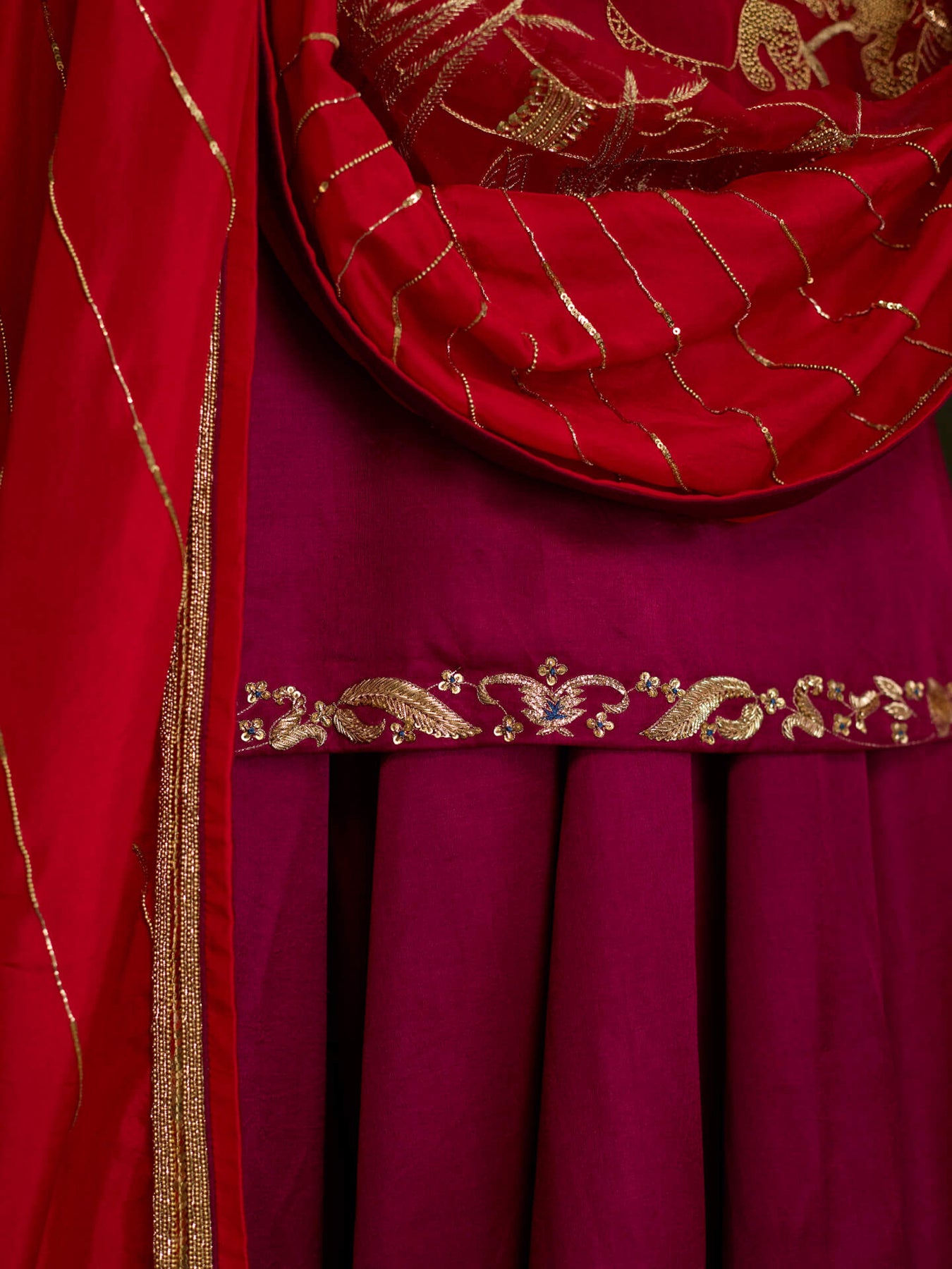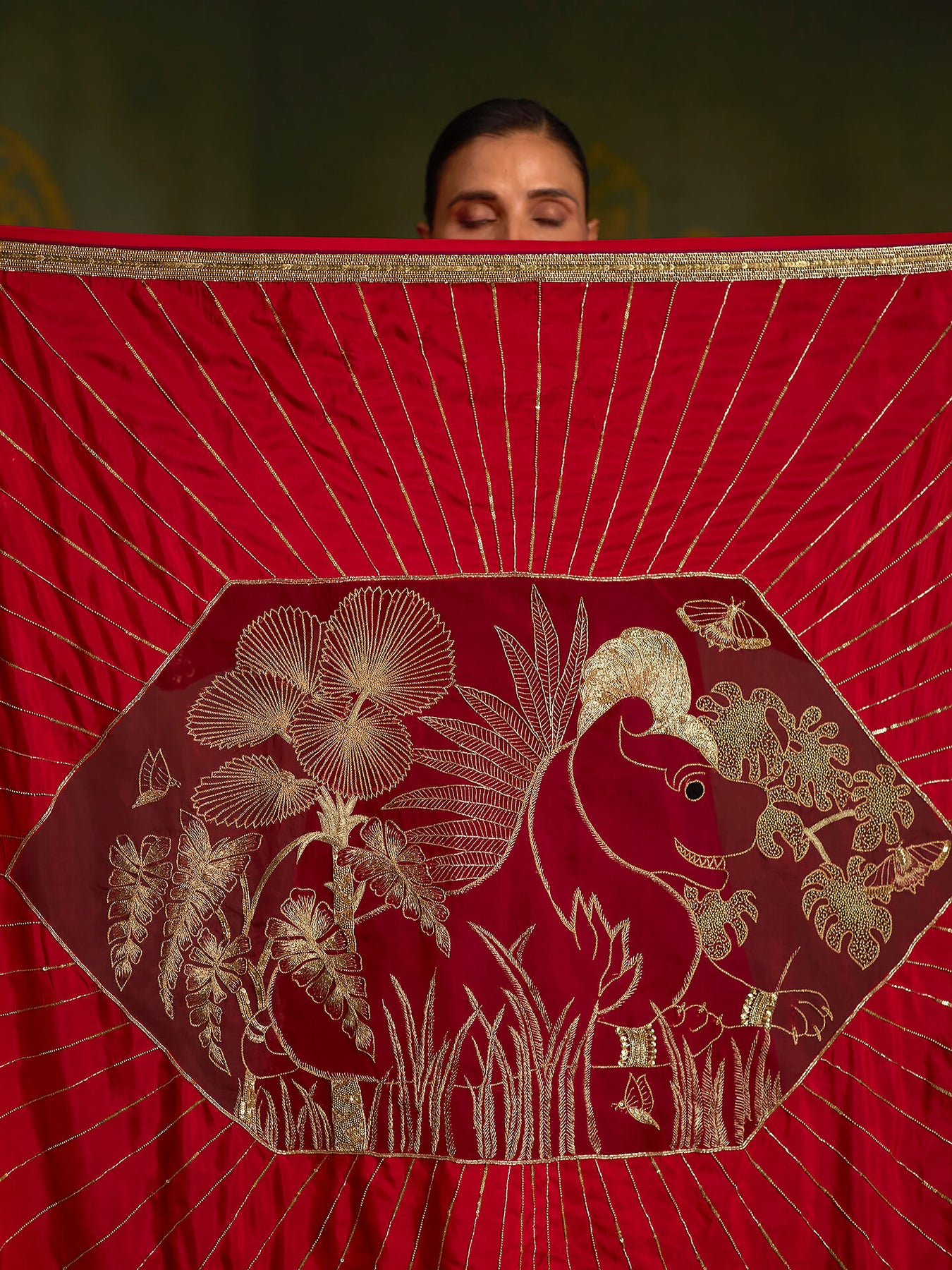 Crafted from rich Gajji silk, this high-low lehenga showcases a striking purple and red contrast, adorned with intricate hand embroidery in dabka, naqshi, and sequins. Paired with a silk organza dupatta adorned with a powerful Yali motif, this ensemble beautifully blends tradition with modern elegance.