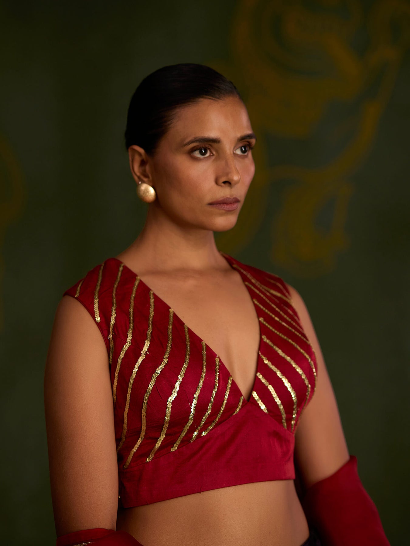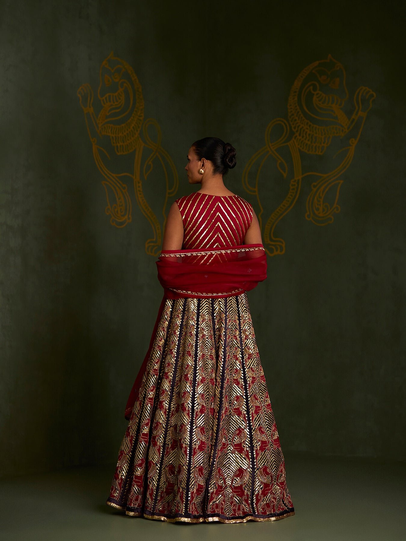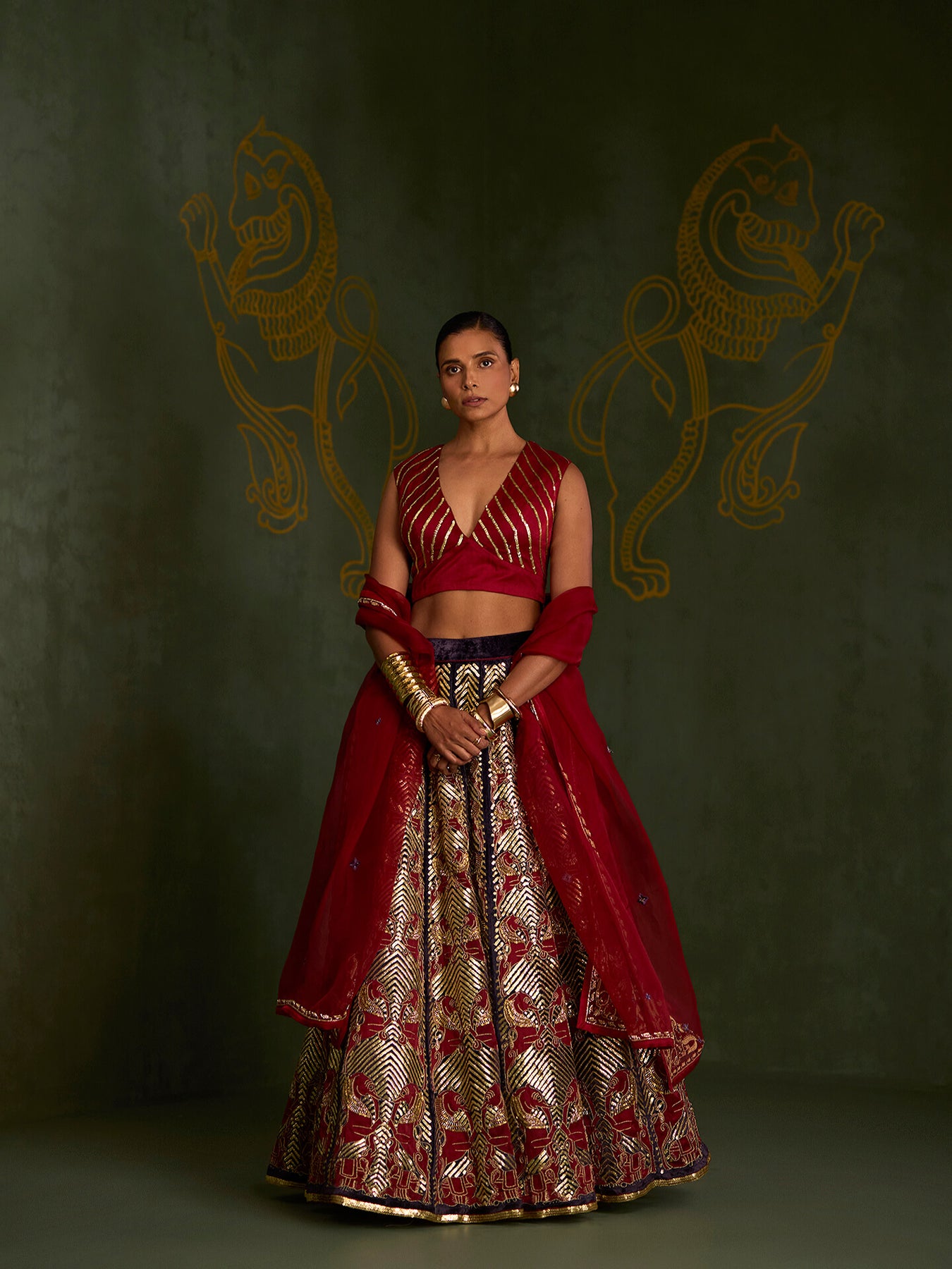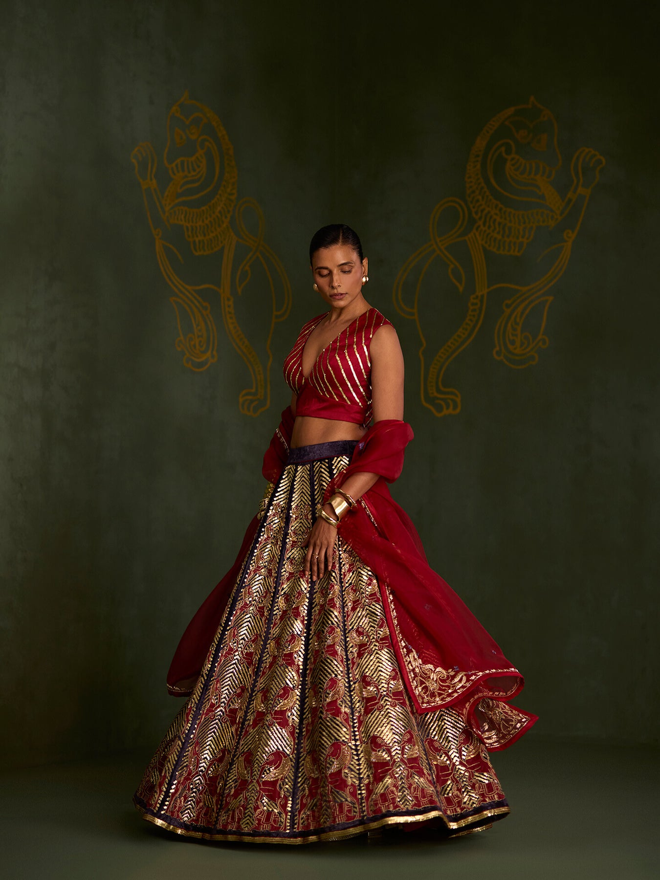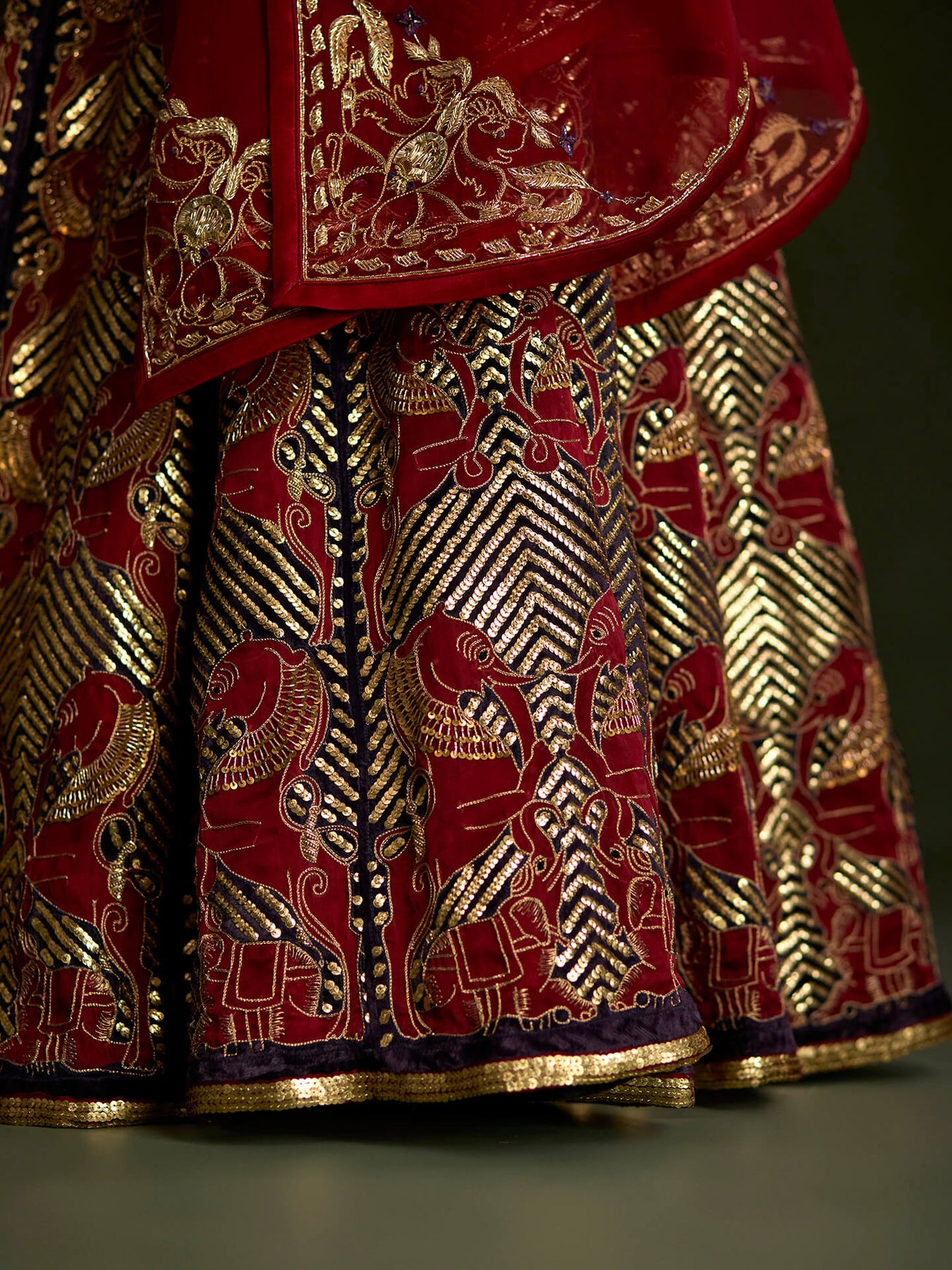 A statement maroon lehenga set featuring a Gajji silk embroidered blouse, organza lehenga with velvet patches, and an organza dupatta. The lehenga showcases exquisite Yali motifs-ancient mythological creatures symbolizing strength and power, brought to life through intricate naqshi, dabka, and sequin hand embroidery. A perfect blend of heritage and modern design for weddings and festive occasions.